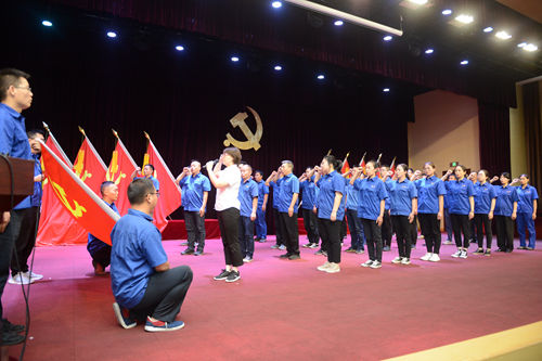 大會在莊嚴(yán)的國歌聲中開始。35名新黨員面對黨旗莊嚴(yán)宣誓,與會全體黨員重溫入黨誓詞。