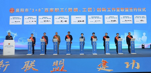 會(huì)上,襄陽(yáng)市“1+8+N”百家勞模(工匠、職工)創(chuàng)新工作室聯(lián)盟舉行簽約儀式。襄軸公司榮膺襄陽(yáng)新能源汽車產(chǎn)業(yè)職工(勞模、工匠)創(chuàng)新工作室聯(lián)盟牽頭單位,公司黨委書記、董事長(zhǎng)高少兵受邀上臺(tái)與市總工會(huì)簽約。